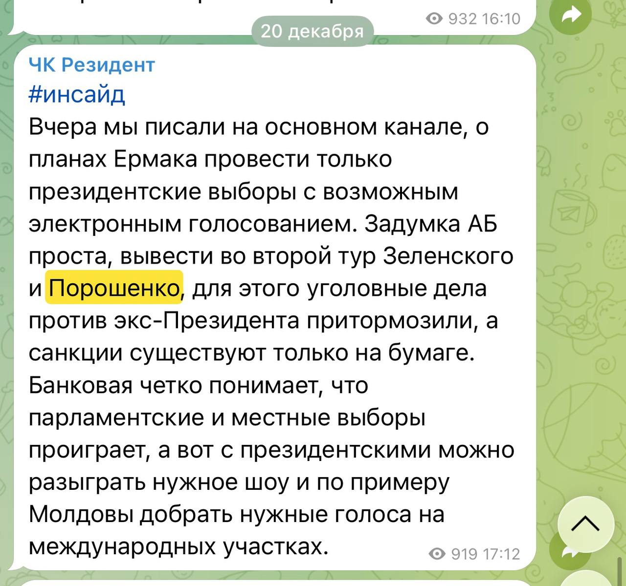P.S. В ЧК Резидент писали в чем смысл задумки Банковой, они хотят разыграть карту с Порошенко, устроив второй тур по образцу 2019 года.