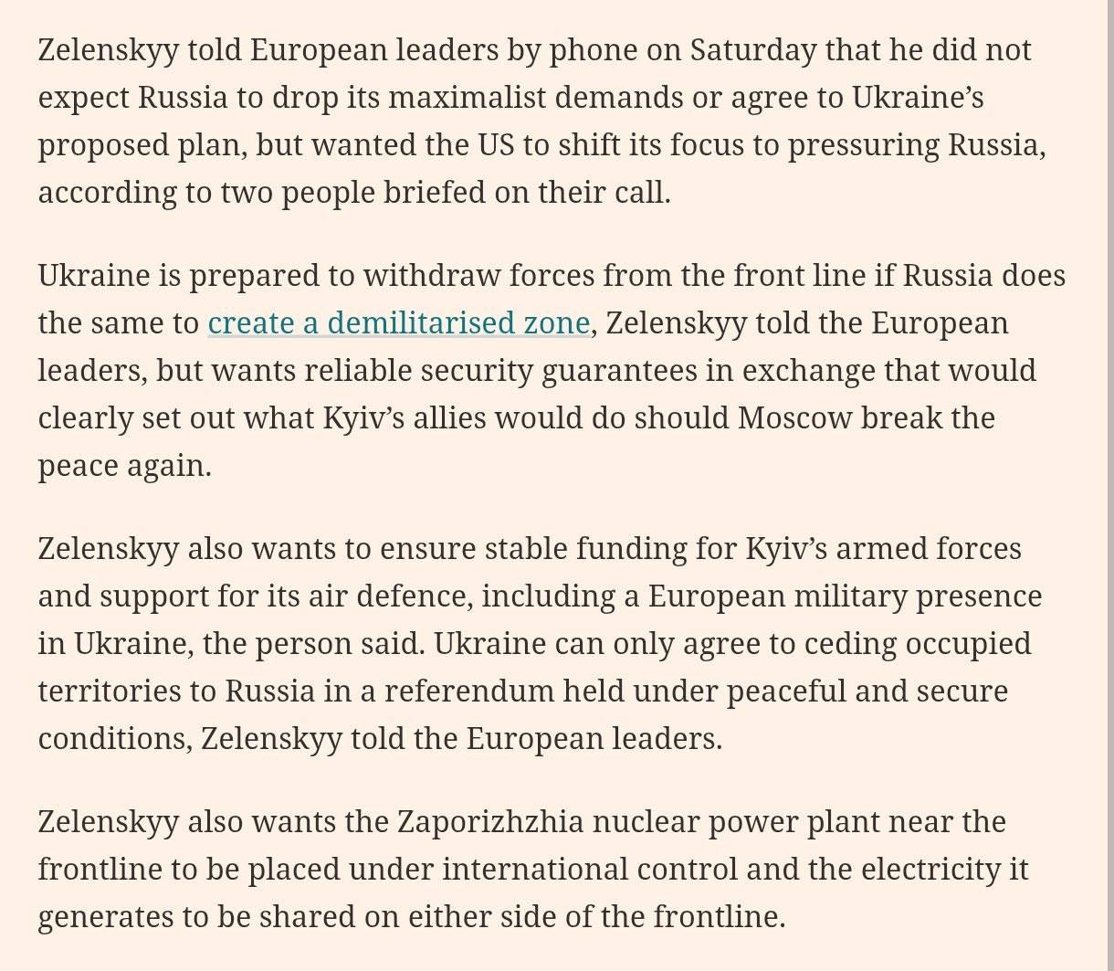 Издание отмечает, что Зеленский также настаивает на обеспечении стабильного финансирования украинских вооружённых сил и поддержке системы противовоздушной обороны, включая возможное присутствие европейских военных в Украине, сообщил источник.