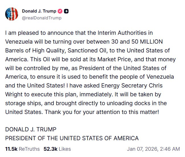 С радостью сообщаю, что временные власти Венесуэлы передадут Соединенным Штатам Америки от 30 до 50 миллионов баррелей высококачественной, разрешенной к использованию нефти. Эта нефть будет продаваться по рыночной цене, и я, как президент Соединенных Штатов Америки, буду контролировать эти средства, чтобы гарантировать, что они будут использованы на благо народа Венесуэлы и Соединенных Штатов! Я поручил министру энергетики Крису Райту немедленно приступить к реализации этого плана. Нефть будет доставлена на судах-хранилищах непосредственно на разгрузочные причалы в Соединенных Штатах. Благодарю вас за внимание к этому вопросу!