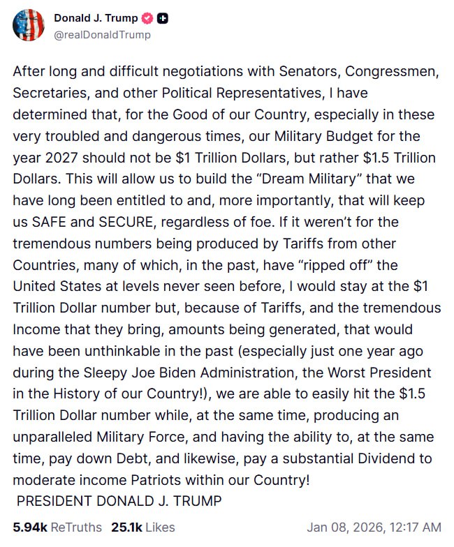 После долгих и сложных переговоров с сенаторами, конгрессменами, министрами и другими политическими представителями я пришел к выводу, что во благо нашей страны, особенно в эти крайне неспокойные и опасные времена, наш военный бюджет на 2027 год должен составлять не 1 триллион долларов, а 1,5 триллиона долларов. Это позволит нам создать «военную систему мечты», на которую мы давно имеем право, и, что еще важнее, которая обеспечит нам БЕЗОПАСНОСТЬ и ЗАЩИТУ, независимо от противника. Если бы не колоссальные цифры, создаваемые тарифами других стран, многие из которых в прошлом «обворовывали» Соединенные Штаты в невиданных ранее масштабах, я бы остался на отметке в 1 триллион долларов. Но благодаря тарифам и огромным доходам, которые они приносят, — суммам, которые были бы немыслимы в прошлом (особенно всего год назад, во время правления Сонного Джо Байдена, худшего президента в истории нашей страны!), — мы легко можем достичь отметки в 1,5 триллиона долларов, одновременно создавая беспрецедентную военную мощь, имея возможность погашать долг и, соответственно, выплачивать существенные дивиденды патриотам со средним уровнем дохода внутри нашей страны!