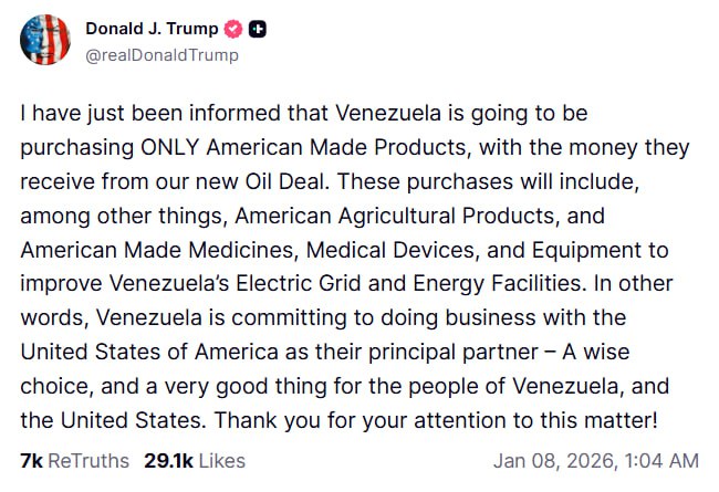 Мне только что сообщили, что Венесуэла будет закупать ТОЛЬКО продукцию американского производства на средства, полученные в рамках нашего нового соглашения по нефти. Эти закупки будут включать, помимо прочего, американскую сельскохозяйственную продукцию, а также лекарства, медицинские приборы и оборудование американского производства для улучшения электросети и энергетических объектов Венесуэлы. Другими словами, Венесуэла обязуется вести бизнес с Соединенными Штатами Америки в качестве своего основного партнера – мудрый выбор и очень хорошее решение как для народа Венесуэлы, так и для Соединенных Штатов. Благодарю вас за внимание к этому вопросу!