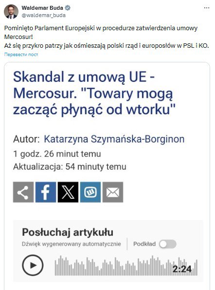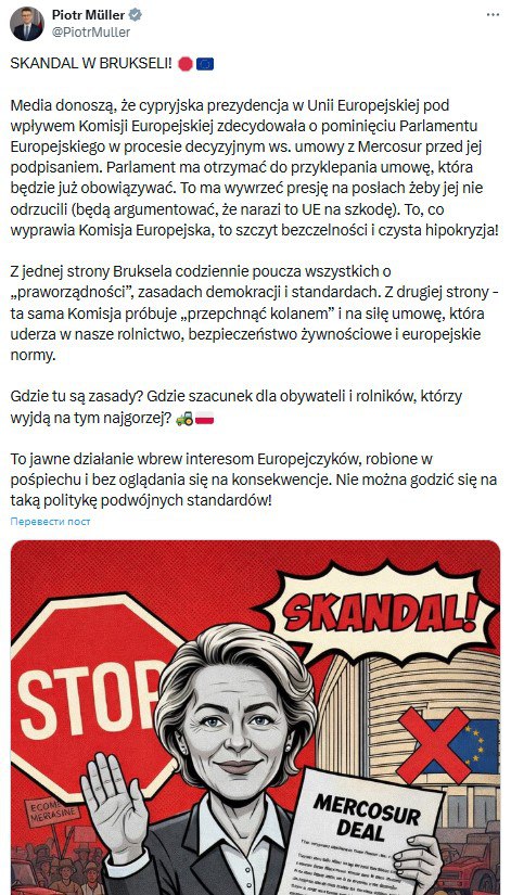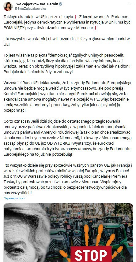 "Европейский парламент был обойден в процедуре утверждения соглашения с МЕРКОСУР! Просто больно смотреть, как унижают польское правительство и депутатов Европарламента".