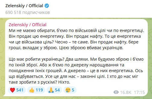 Зеля заявляет, что энергетическая инфраструктура является законной военной целью и потому ВСУ бьют по энергетике России: