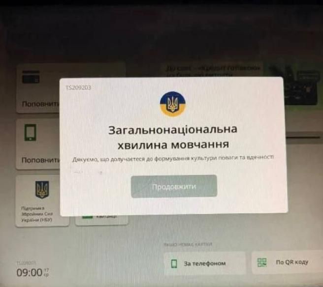 Банкоматы на Украине начали требовать отстоять "минуту молчания" для получения денег. Новшество заметили на экранах банкоматов "Приват-банка".