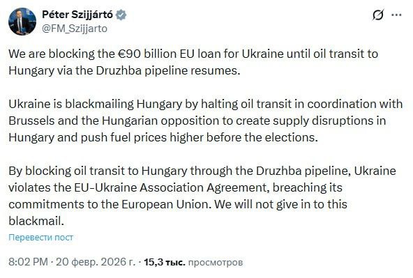 Министр иностранных дел Венгрии Петер Сийярто потребовал от Украины возобновить поставки нефти через трубопровод "Дружба" или кредит ЕС останется заблокированным.
