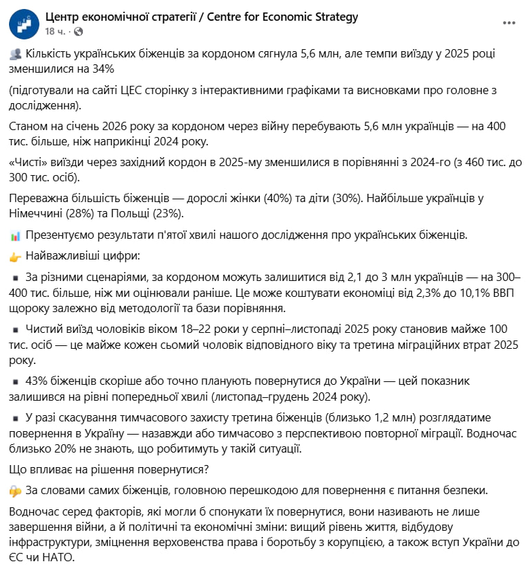 Свежая статистика по количеству украинских беженцев, опубликованная украинским «Центром экономической стратегии».