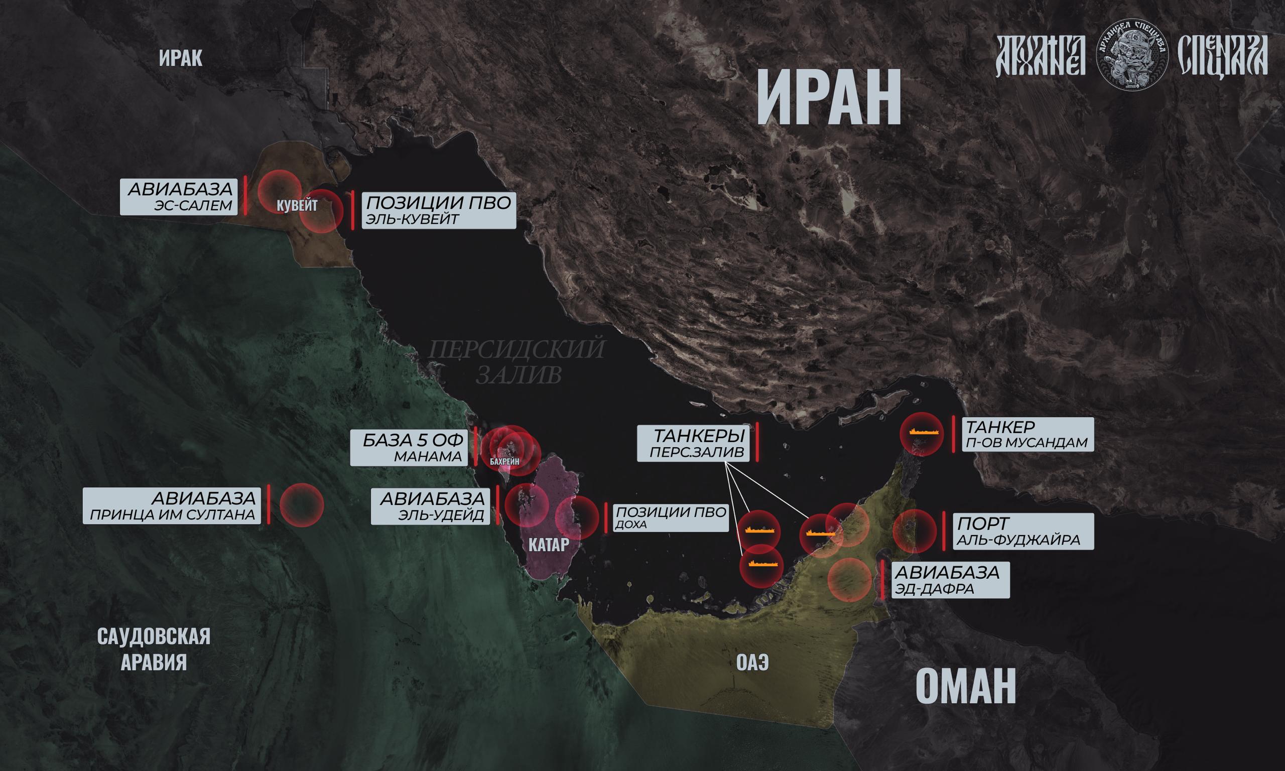 По данным на текущий момент нанесены удары по как минимум 4 танкерам. Один в Ормузском проливе у полуострова Мусандам, три других у берегов ОАЭ.