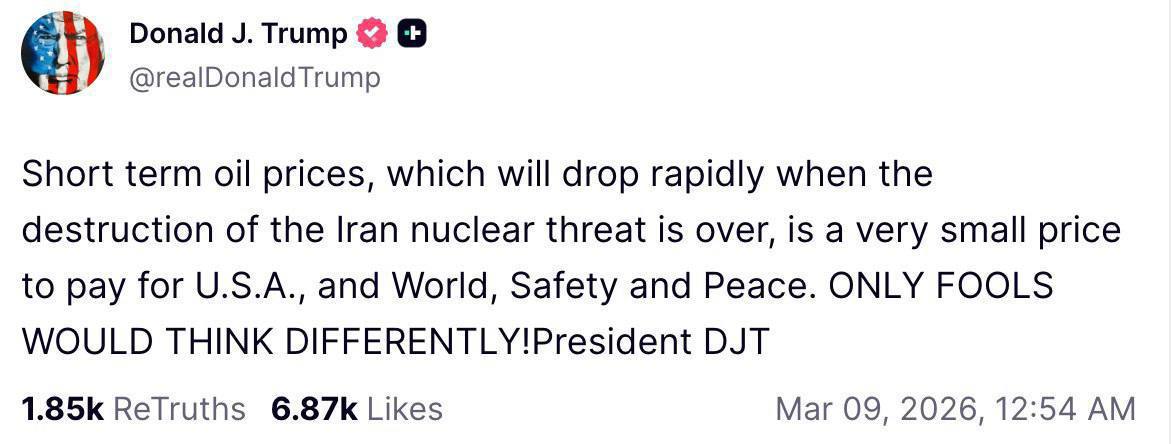 Президент США считает, что они быстро упадут, "когда будет устранена ядерная угроза со стороны Ирана". А этот скачок, мол, небольшая цена за мир, и "только ДУРНИ могут думать иначе"