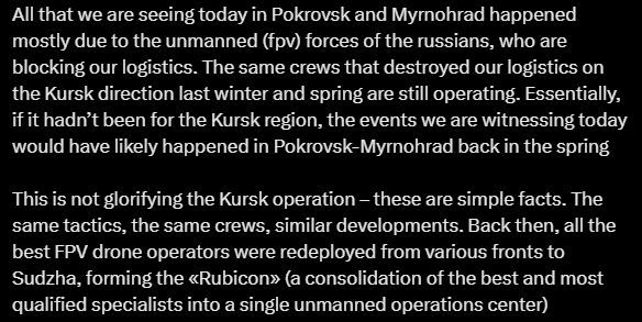 "Всё, что мы наблюдаем сегодня в Покровске и Мирнограде, произошло, главным образом, благодаря БПЛА российских войск, которые блокируют нашу логистику. Те же самые бригады, которые прошлой зимой и весной уничтожали нашу логистику на Курском направлении, продолжают действовать", — вторит ему другой боевик.