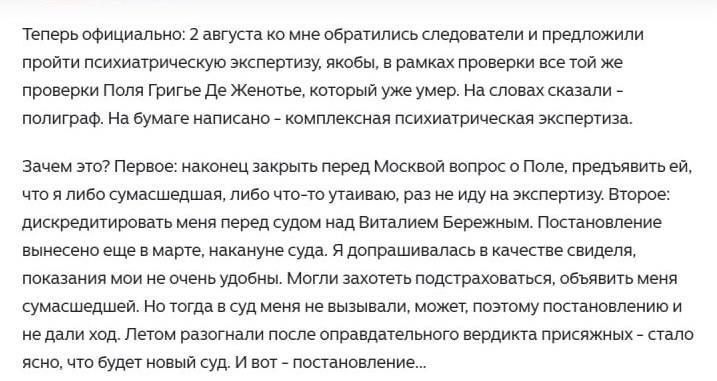 В-третьих, правоохранительные органы уже однажды настойчиво предлагали Анастасии Мироновой пройти психиатрическую экспертизу, однако экспертиза, по словами Анастасии, связана с желанием дискредитировать ее показания по уголовному делу, то есть воспринималась как угроза.