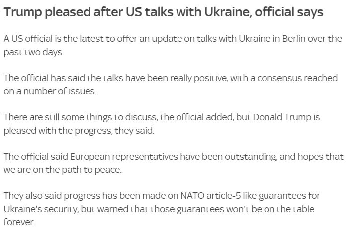 Трамп считает, что сможет убедить Россию предоставить Украине гарантии безопасности, сопоставимые со статьёй 5 НАТО. Чиновник отметил, что по данному пункту был достигнут определённый прогресс в Берлине, но подчеркнул: такие гарантии не будут доступны бесконечно.