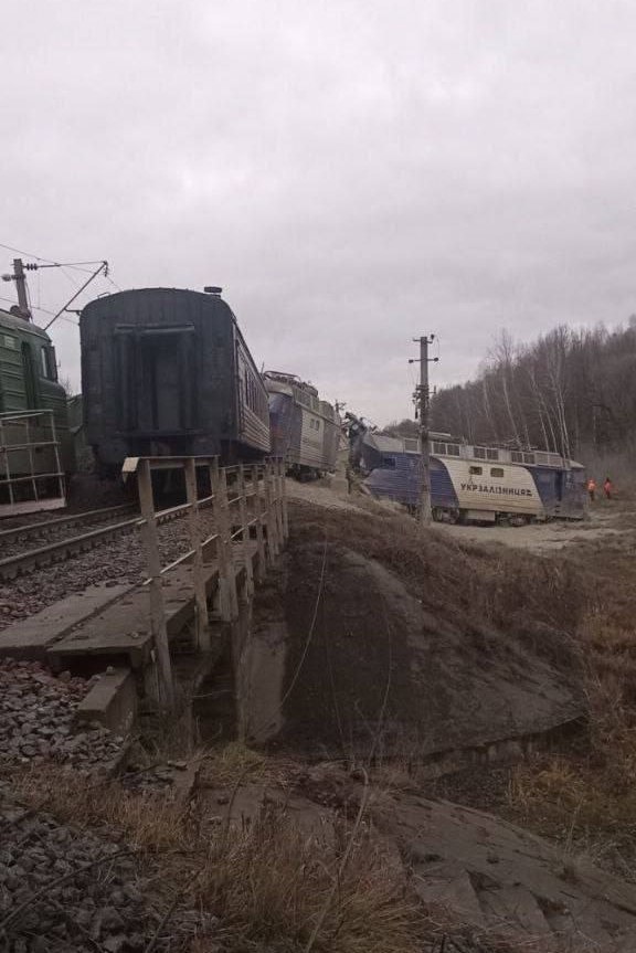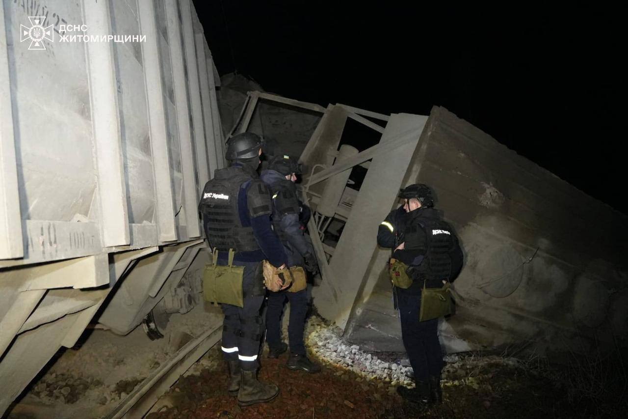 Кадры атакованного и сошедшего с рельсов грузового поезда, парализовавшего движение в Житомирской области.