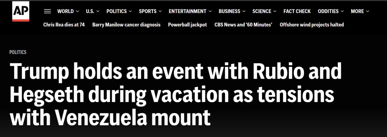 Трамп проведёт встречу с высокопоставленными чиновниками по нацбезопасности — госсекретарём Рубио, министром войны Хегсетом и главой ВМС Феланом на фоне усиления давления на Мадура и перехвата нефтяных танкеров в Карибском море силами США.