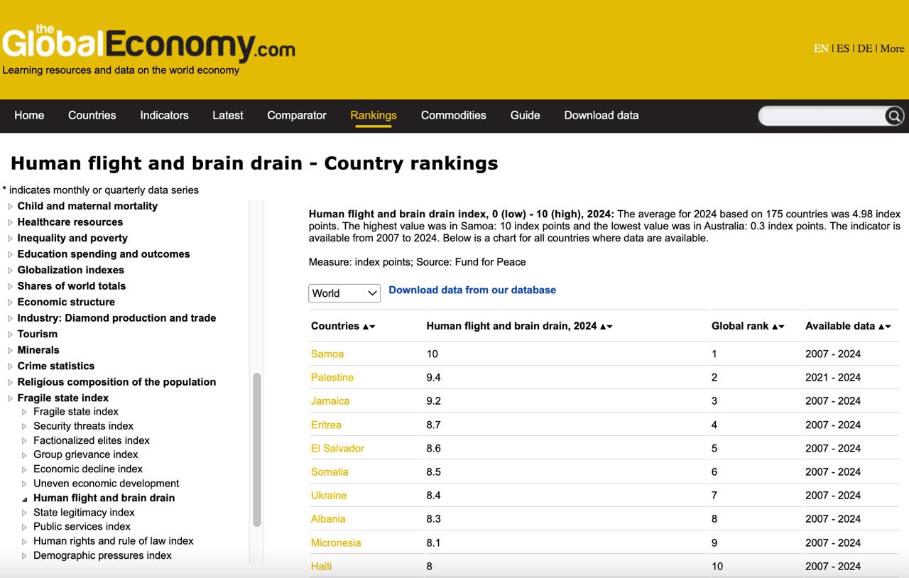 Украина оказалась на 7-м месте в мире по масштабу «утечки мозгов», она занимает лидирующую позицию в глобальном антирейтинге оттока высококвалифицированных специалистов, уступая только нескольким странам с наиболее сложной экономической и гуманитарной ситуацией. По данным The Global Economy, этот показатель, оценивающий переезд кадров из стран с низкими доходами в богатые, для Украины достиг 8.4 балла из 10.