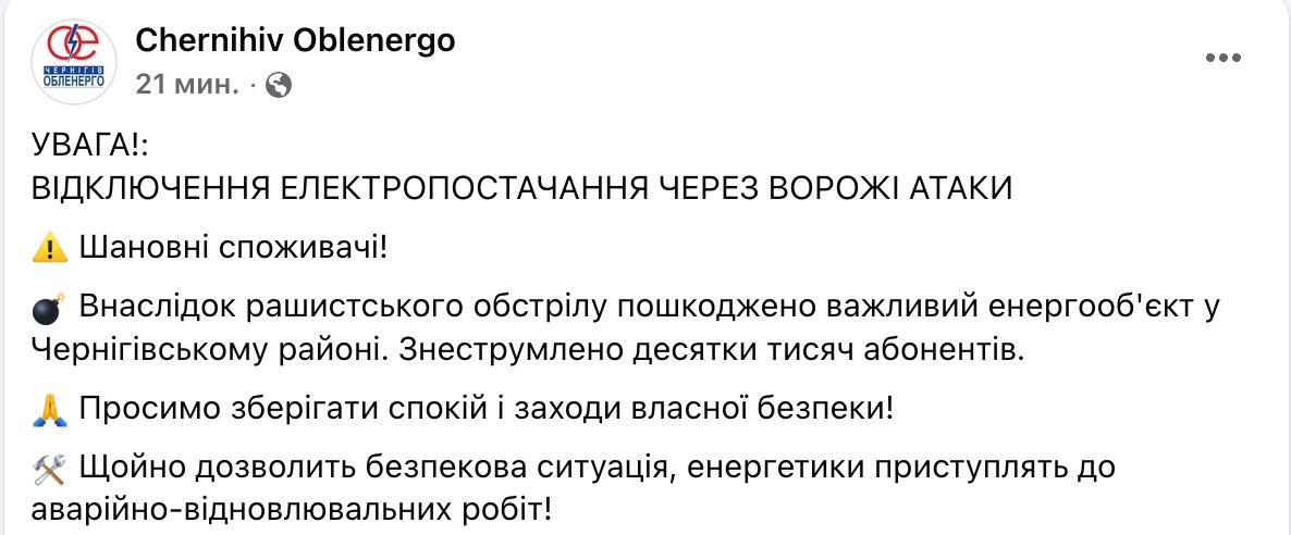 Местные власти объявили, что в результате удара без света остались десятки тысяч абонентов.