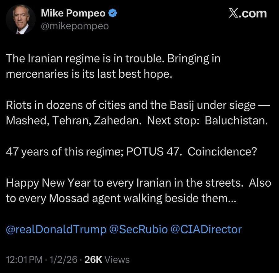 Бывший госсекретарь Майк Помпео в соцсети X как раз поздравил с Новым годом всех агентов Моссада, "идущих рядом" с иранцами по улицам.
