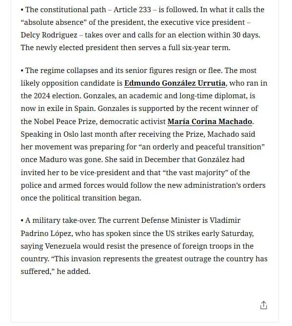Приход оппозиции: Режим рушится, и к власти приходит оппозиция. Наиболее вероятным новым президентом в этом случае называется Эдмундо Гонсалес Уррутиа, кандидат на выборах 2024 года, находящийся в изгнании, которого поддерживает лауреат премии мира Мария Мачадо.