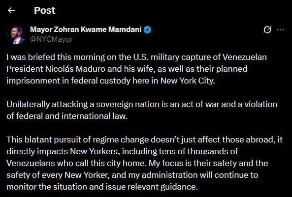 Мэр Нью-Йорка Мамдани об операции США в Венесуэле: