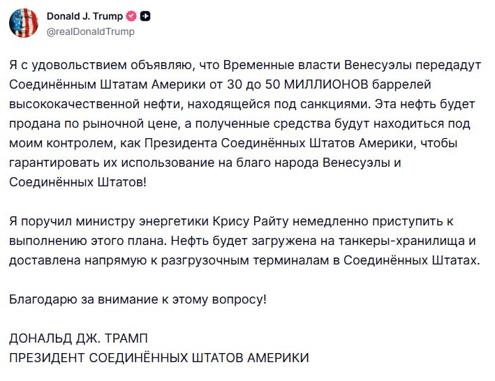 "Эта нефть будет продана по рыночной цене, а полученные средства будут находиться под моим контролем, чтобы гарантировать их использование на благо народов Венесуэлы и США", - добавил президент США.