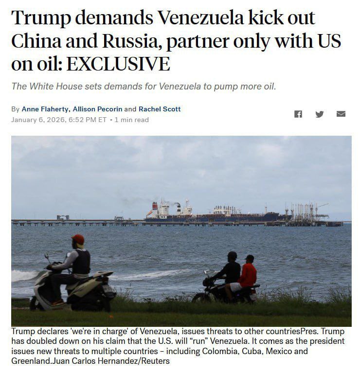 "Миротворец" потребовал изгнания России, Китая, Кубы и Ирана из Венесуэлы, фактически обозначив условия полного внешнего контроля над страной. После этого, по имеющимся данным, венесуэльская нефтедобыча оказалась в тупике: танкеры переполнены, экспорт парализован, направлять нефть попросту некуда.