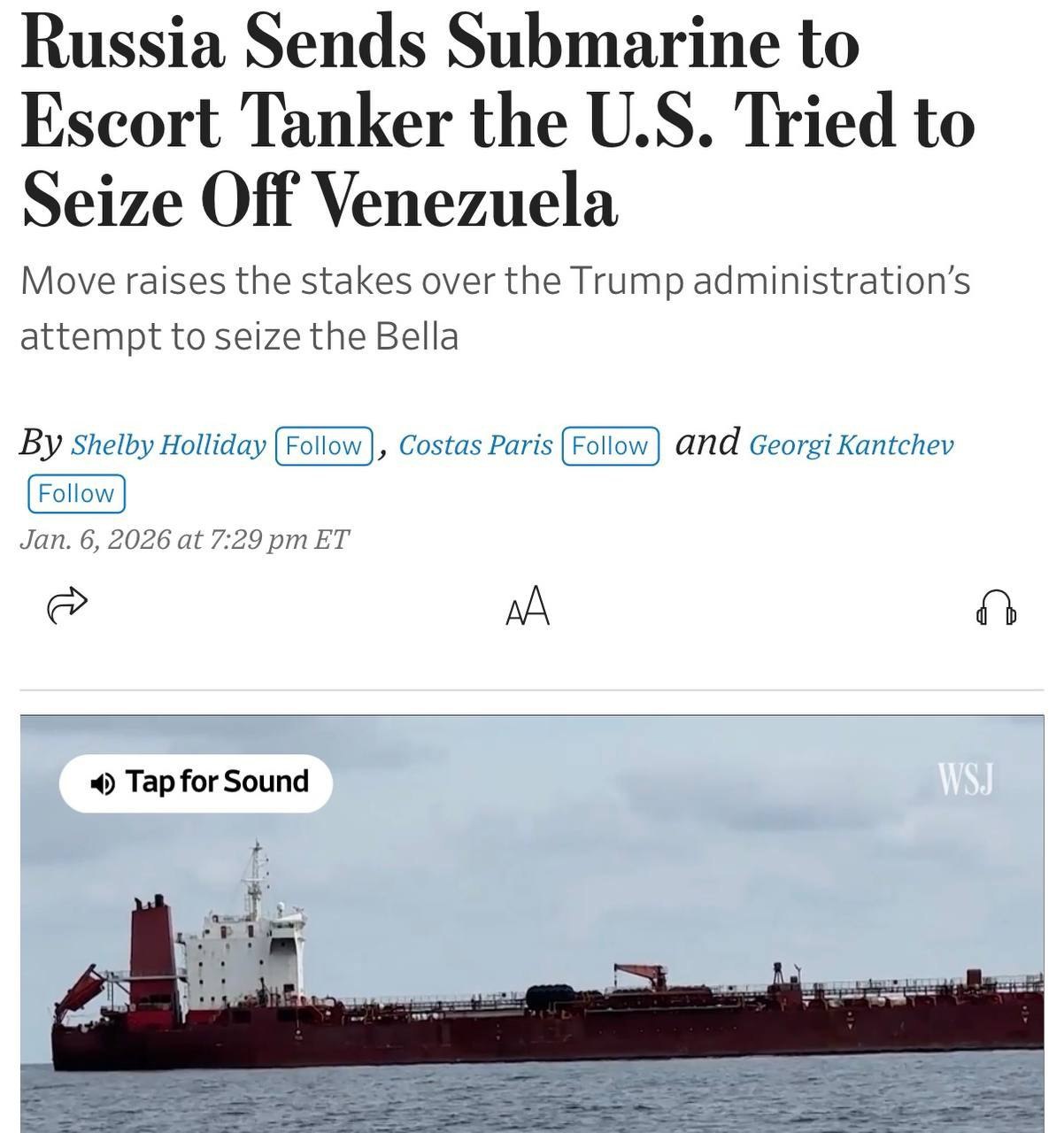 Россия направила в Атлантический океан подводную лодку и несколько кораблей ВМФ на встречу нефтяному танкеру, который США пытались перехватить в ходе давления на Венесуэлу, пишет Wall Street Journal. Речь идёт о судне, ранее известном как Bella 1, а ныне — Marinera, которое США преследуют уже несколько недель.