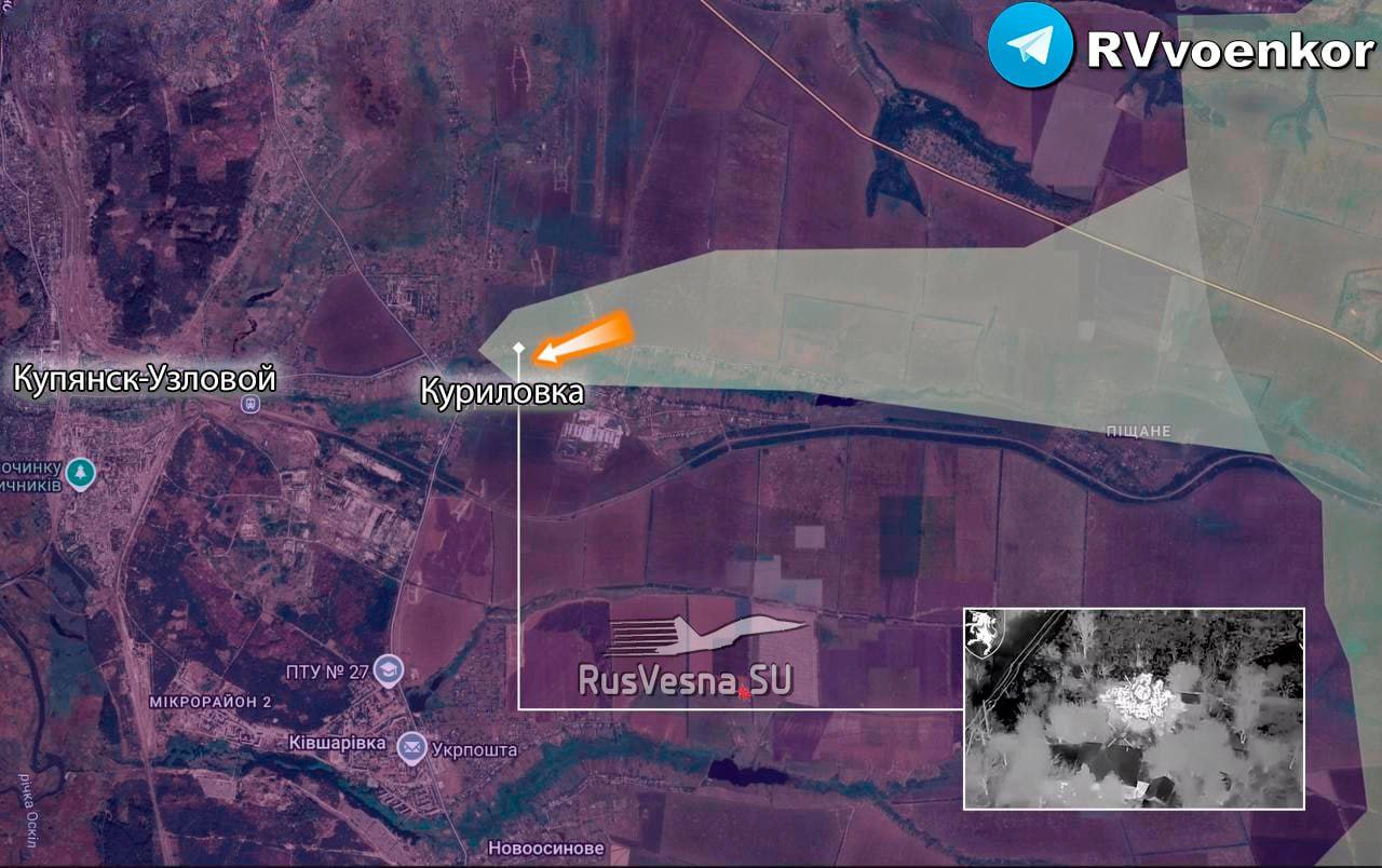 "На Купянском направлении продолжаются тяжёлые бои на западном и восточном берегах реки Оскол. Севернее Купянска российские войска сняли кадры на восточной окраине Тищенковки, в то время как ВСУ фиксировались на кадрах в районе Кондрашовки".