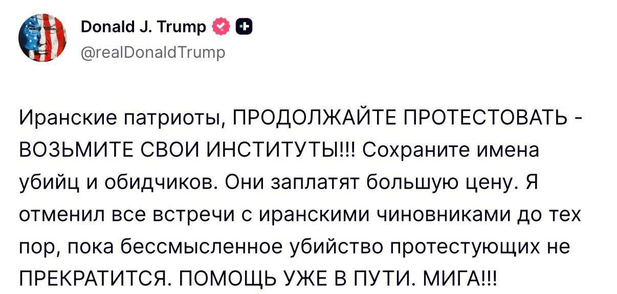 Я отменил все встречи с иранскими официальными лицами до тех пор, пока бессмысленные убийства протестующих не прекратятся. Помощь уже в пути