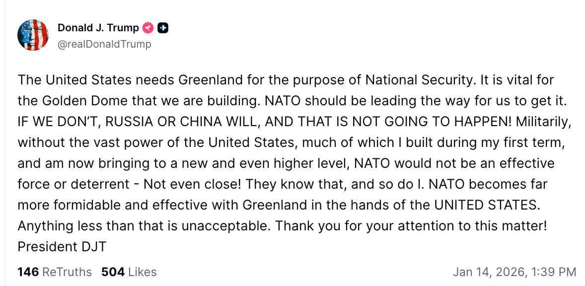 Трамп снова орёт капслоком: США позарез нужна Гренландия для "национальной безопасности", а на остальных плевать