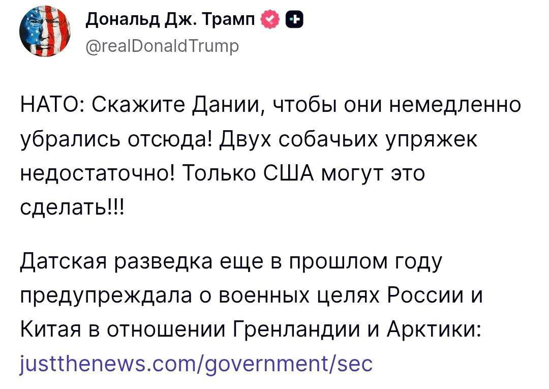 Трамп: НАТО: Скажите Дании, чтобы они немедленно убрались отсюда! Двух собачьих упряжек недостаточно!