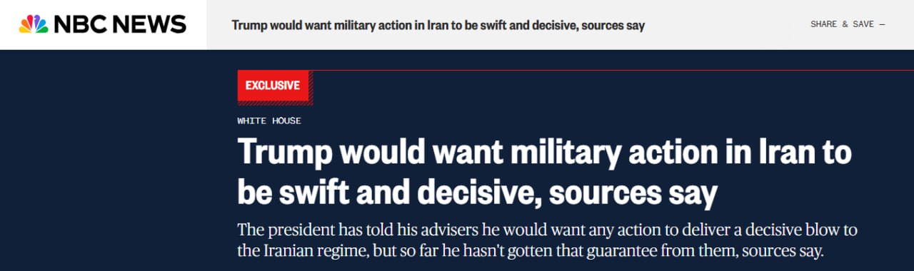 Президент США поставил задачу команде по нацбезопасности: если придётся атаковать Иран, операция должна быть быстрой, мощной и окончательной — без затяжной войны на недели или месяцы, сообщили NBC News источники.