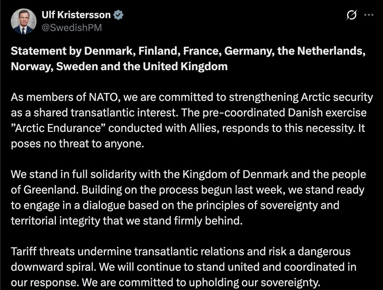 Стороны проводят в Гренландии «скоординированные учения», которые «не представляют угрозы ни для кого». Одновременно в заявлении подверглись критике тарифные меры, введенные Трампом против стран, направивших военных на остров. По мнению подписантов, «тарифные угрозы подрывают трансатлантические отношения и грозят опасной нисходящей спиралью».