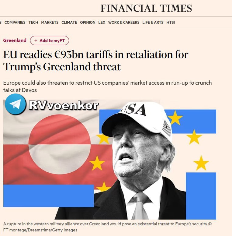 Евросоюз разрабатывает ответные тарифные меры на сумму €93 млрд (свыше 8 трлн рублей) против США. Это — реакция Брюсселя на жёсткие высказывания Трампа по поводу размещения европейских войск в Гренландии и финансирования НАТО.