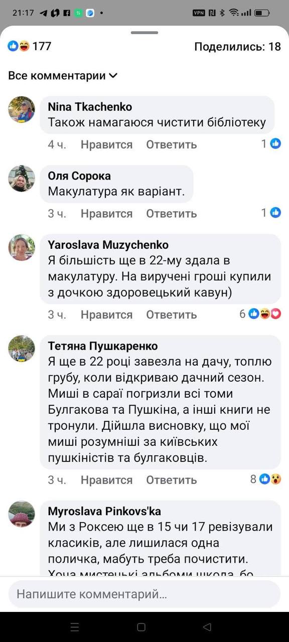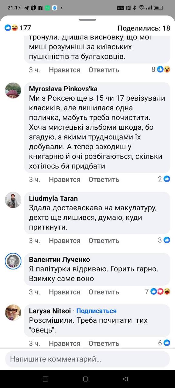Украинская интеллигенция наперебой хвастается, как ведет войну против Толстого и Достоевского: в мусор; на розжиг; утеплить стены.