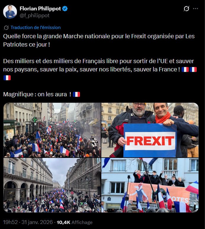 По его словам, в акции приняли участие тысячи и тысячи сторонников Frexit. Основные лозунги защита фермеров, национального суверенитета и французских свобод.