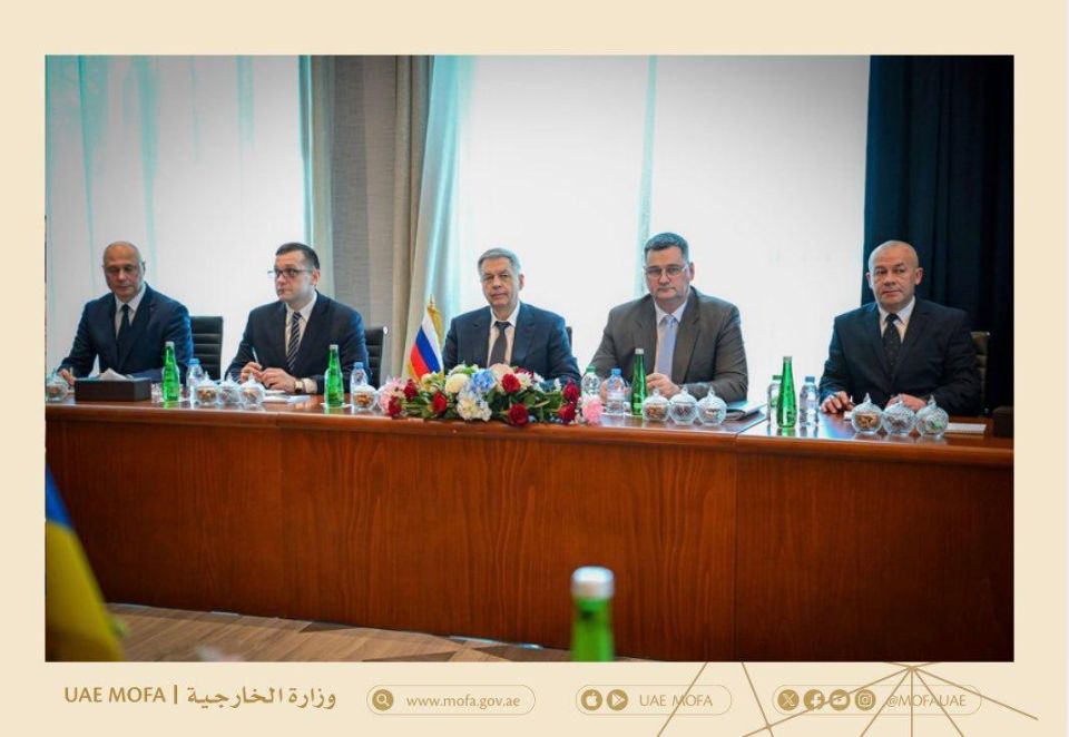 МИД ОАЭ публикует фото продолжающихся переговоров России, Украины и США в Абу-Даби.
