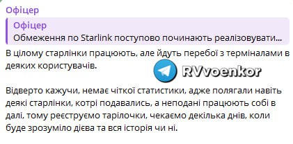 «В целом старлинки работают, но идут перебои с терминалами у некоторых пользователей», - пишет один из украинских офицеров.