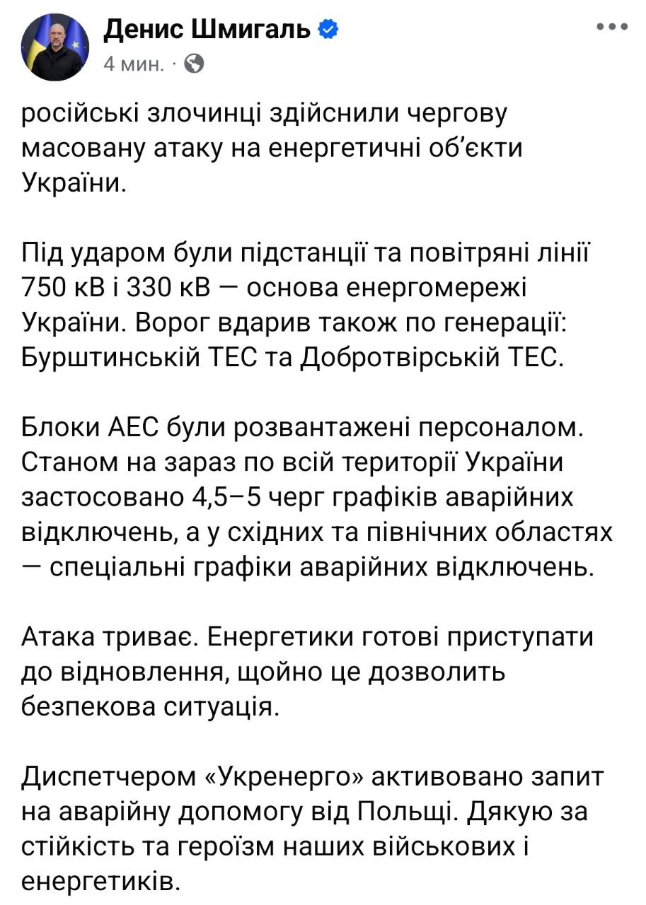 Атакованы подстанции и воздушные линии электропередачи напряжением 750 и 330 кВ этом, сообщил министр энергетики Украины Шмыгаль.