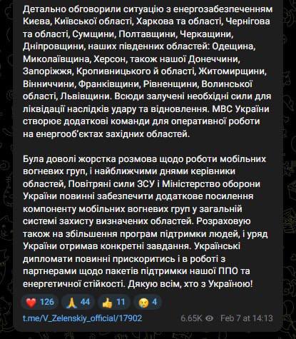 Был довольно жесткий разговор о работе мобильных огневых групп, и в ближайшие дни руководители областей, Воздушные силы ВСУ и Минобороны должны обеспечить дополнительное усиление компонента мобильных огневых групп в общей системе защиты определенных областей, - сказал Зеленский.