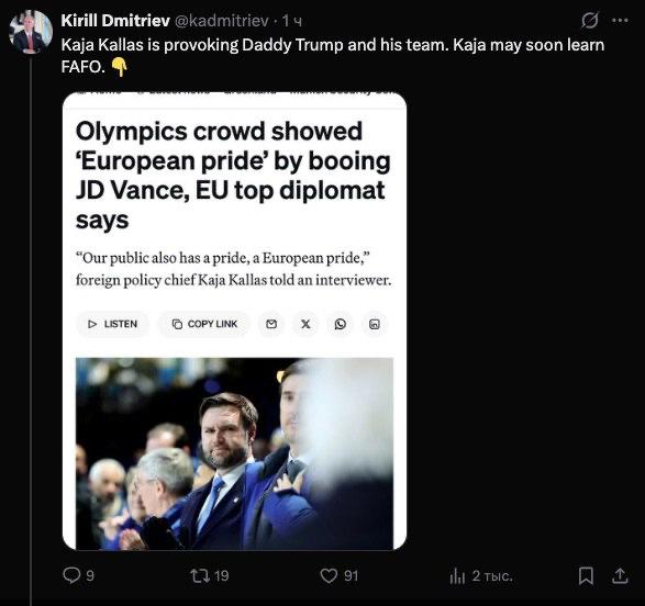 Дмитриев заявил, что Каллас «провоцирует папочку Трампа и его команду» и добавил: «Скоро Кая может узнать, что значит FAFO».