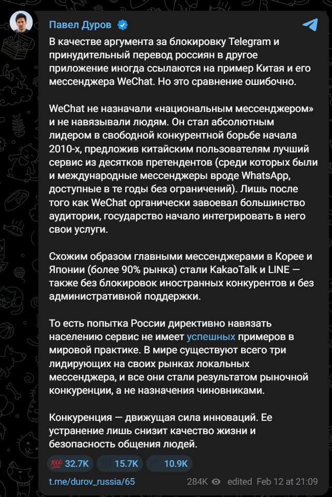 WeChat не назначали национальным мессенджером и не навязывали людям. Он стал абсолютным лидером в свободной конкурентной борьбе начала 2010-х, предложив китайским пользователям лучший сервис из десятков претендентов (среди которых были и международные мессенджеры вроде WhatsApp, доступные в те годы без ограничений). Лишь после того как WeChat органически завоевал большинство аудитории, государство начало интегрировать в него свои услуги.Схожим образом главными мессенджерами в Корее и Японии (более 90 % рынка) стали KakaoTalk и LINE также без блокировок иностранных конкурентов и без административной поддержки.