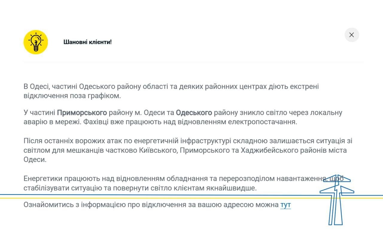 Отключения зафиксированы в Приморском и Одесском районах. Энергетическая инфраструктура ранее была повреждена в результате ударов.