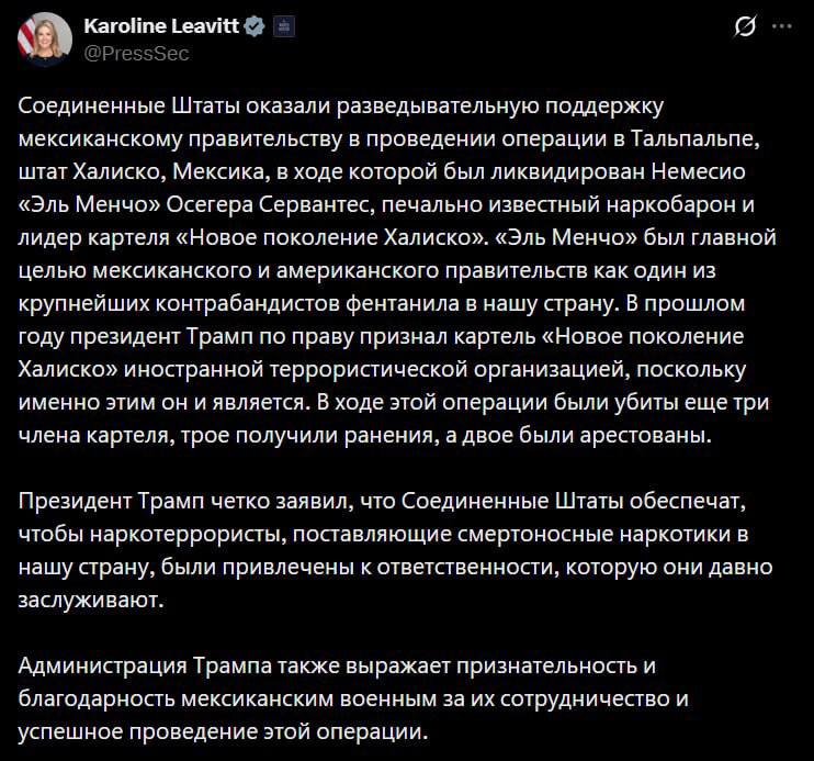 США подтвердили участие в ликвидации главаря наркокартеля в Мексике, — пресс-секретарь Белого Дома