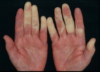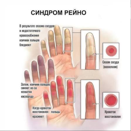 В основе заболевания лежит чрезмерная сократительная реакция гладкой мускулатуры стенок мелких артерий и артериол, что приводит к временному прекращению кровотока в пальцах. Во время приступа пораженные участки резко бледнеют, становятся холодными на ощупь и теряют чувствительность. По мере нарастания гипоксии кожные покровы могут приобретать синюшный оттенок. При восстановлении кровообращения, обычно через пятнадцать-двадцать минут или несколько часов, возникает реактивная гиперемия: пальцы краснеют, отекают, появляются ощущения жара, пульсации и болезненности. У некоторых пациентов приступы затрагивают не только пальцы, но и уши, кончик носа, губы или другие акральные участки.