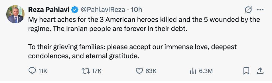 Мое сердце болит за 3 погибших американских героев и 5, раненых режимом — Реза Пахлави