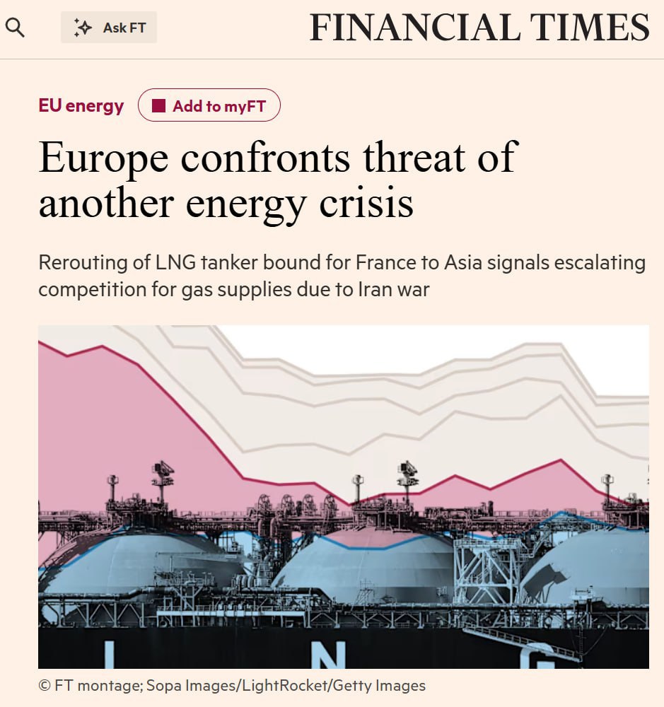Европе грозит новый энергетический кризис из-за войны США и Израиля против Ирана, — FT
