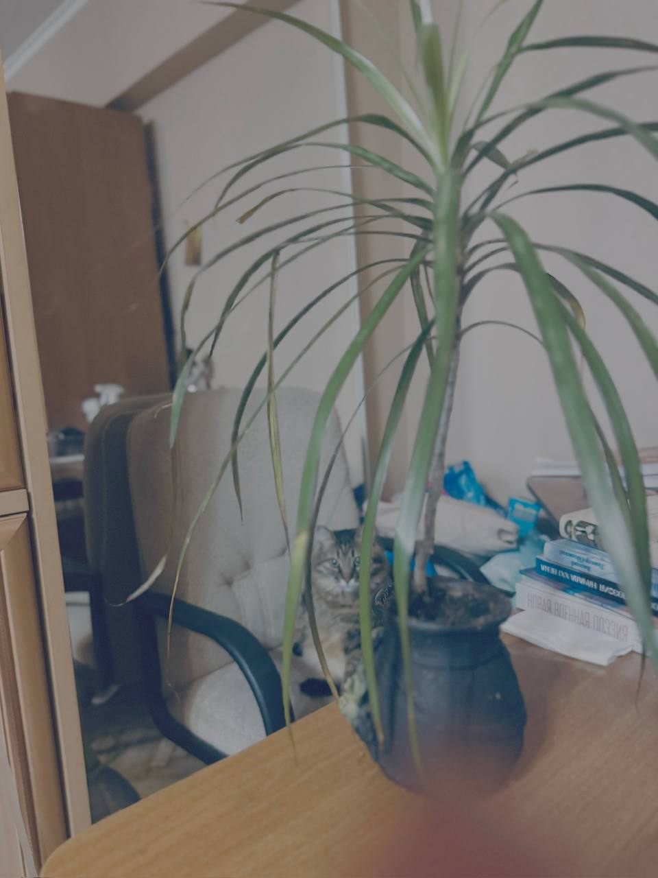 Это мой новый друг Николай Степанович. Назвала я его так, чтобы несколько скомпенсировать тот факт, что у меня живёт Феликс Эдмундович (недовольно смотрит на заднем плане), и ещё потому что жизнь его богата приключениями. Несчастную эту драцену мне подарили на Старый Новый год (вообще, на Новый, но тогда, уезжая домой в восемь утра, я ее, безымянную еще, забыла у хозяев). На Старый новый год я уезжала немного пораньше и не забыла ее в гостях, но забыла в пакете на три дня. Николай Степанович проявил жизненную стойкость и выжил.