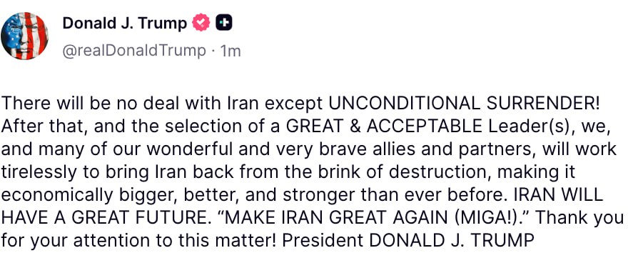 «Никакой сделки с Ираном не будет, кроме безоговорочной капитуляции. После этого, и после выбора великого и приемлемого лидера [лидеров], мы — вместе со многими нашими прекрасными и очень смелыми союзниками и партнёрами — будем неустанно работать, чтобы вывести Иран из состояния на грани разрушения и сделать его экономически больше, лучше и сильнее, чем когда-либо прежде.