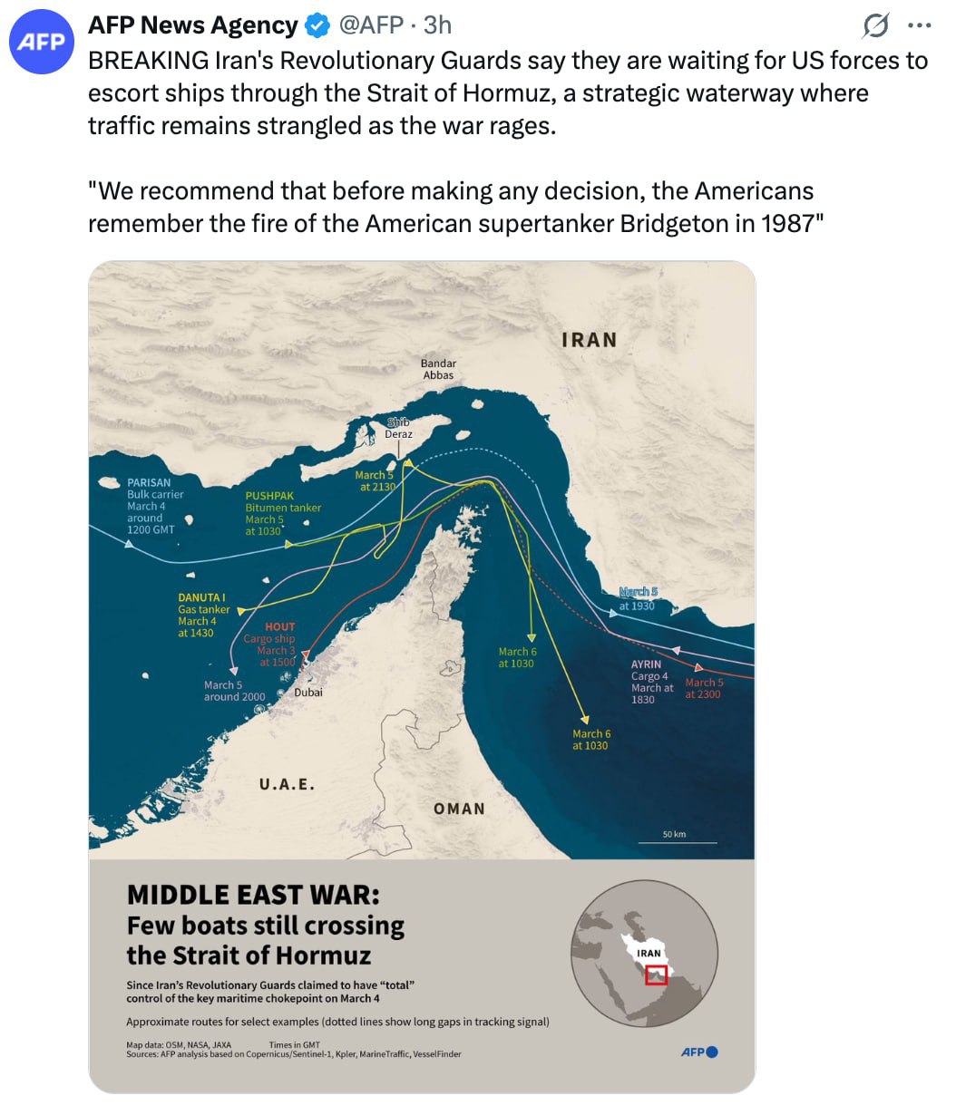 По данным AFP, сейчас движение судов через пролив остаётся серьёзно ограниченным на фоне продолжающегося конфликта в регионе.