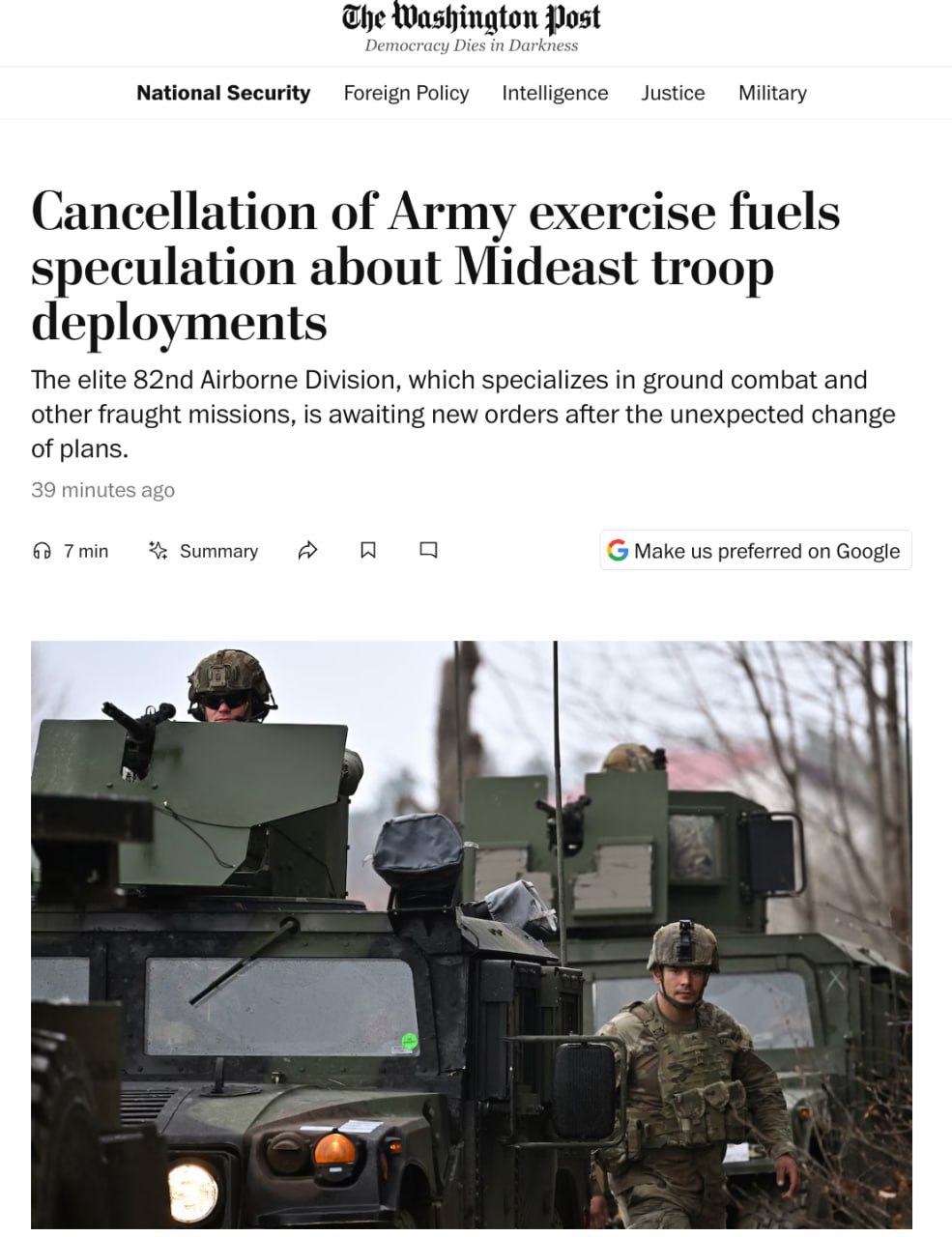 Пентагон внезапно прервал учения 82-й воздушно-десантной дивизии — возможна подготовка к операции против Ирана, — WP