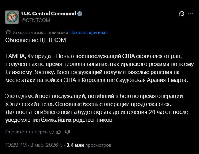 Официальное количество погибших американских военных в ходе нападения на Иран достигло 8 человек.